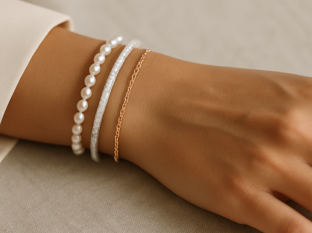 - Nutzen Sie Klettbänder oder kleine Silikonringe, um feine Armbänder auf gleicher Höhe zu halten – so wirken Stacks ordentlicher.